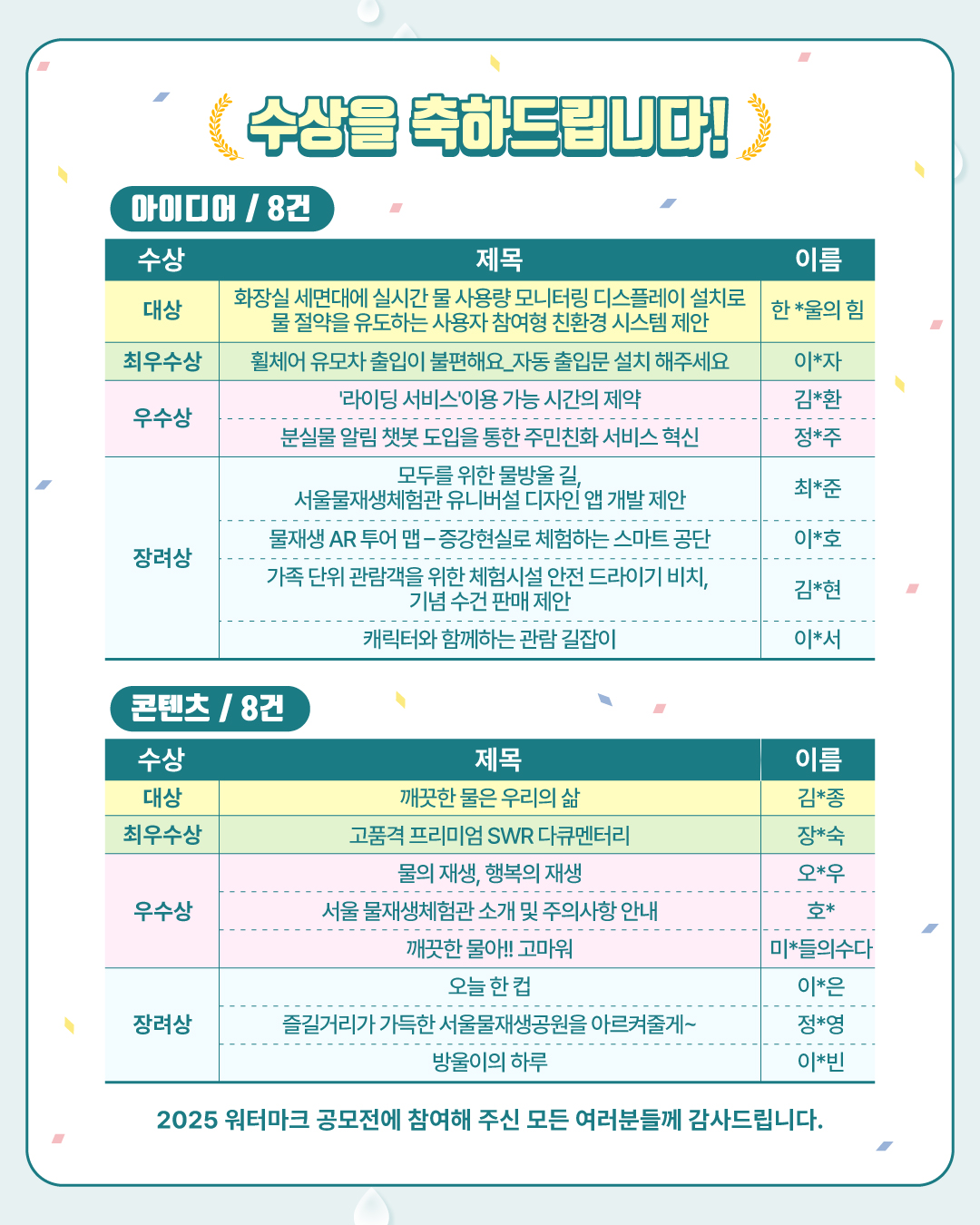 서울물재생시설공단에서 주최하는 2025 워터마크 공모전이 성황리에 마무리 되었습니다.